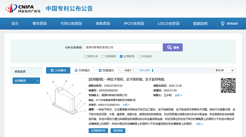 近日,湘潭華聯(lián)電機(jī)有限公司自主研發(fā)的“一種定子鐵芯、定子鐵芯組、定子及其電機(jī)”技術(shù),成功獲得國家知識(shí)產(chǎn)權(quán)局授權(quán),專利號(hào)為CN223729513U。此項(xiàng)專利于2025年1月正式提出申請(qǐng),2025年12月26日授權(quán)公告,標(biāo)志著公司在電機(jī)核心零部件設(shè)計(jì)領(lǐng)域取得了新的突破。